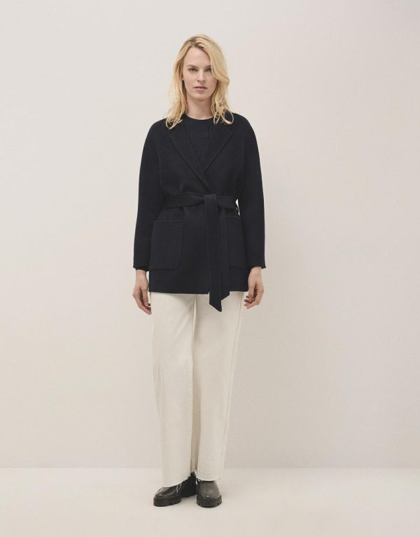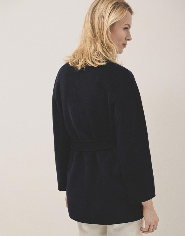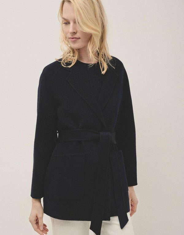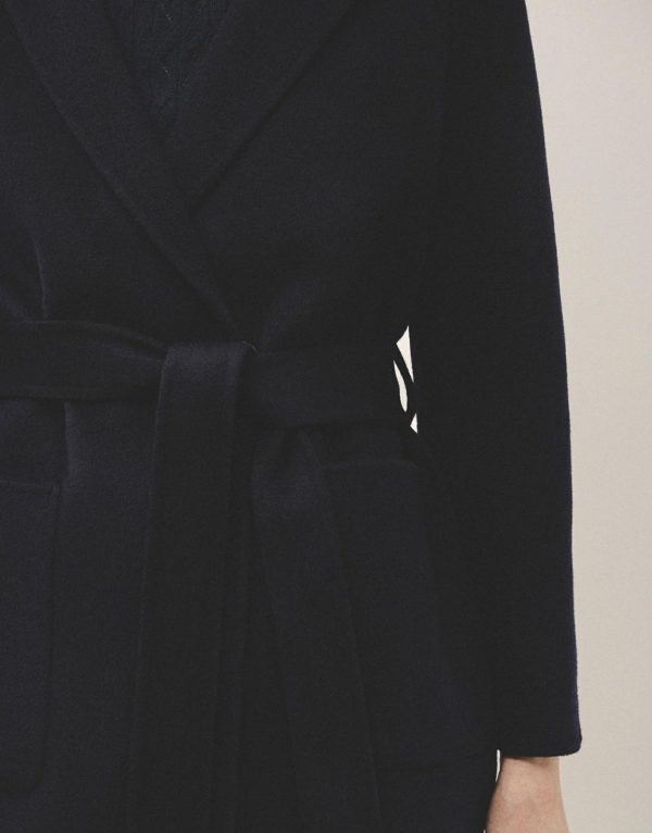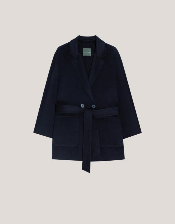 Abrigo corto con cierre cruzado en una lana doble faz azul marino. Cuello solapa, cierre con fila de botones, dos bolsillos de plastrón en delantero y cinturón de atar.