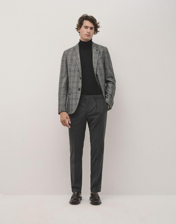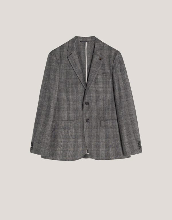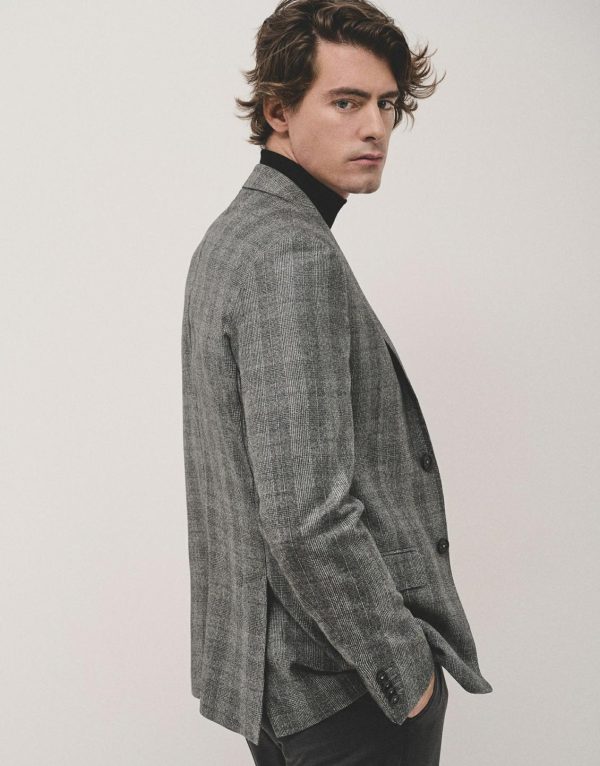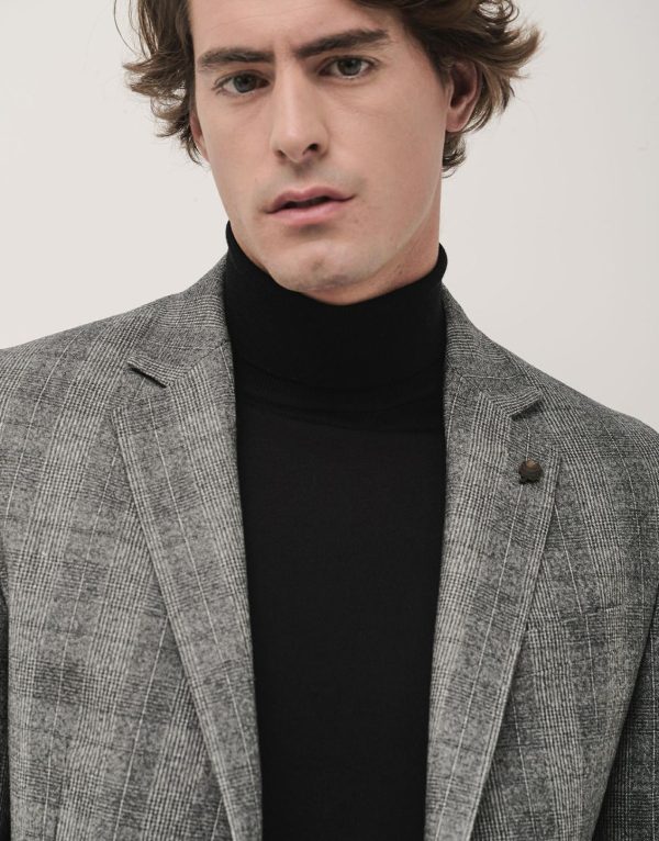 Americana de punto cuadros en tonos grises con interior envivado y medio forro. Cuello con solapas, dos bolsillos con tapeta y un bolsillo insertado a la altura del pecho, cierre con dos botones y manga larga terminada en puño de cuatro botones. Tiene pantalón a juego para completar el traje.