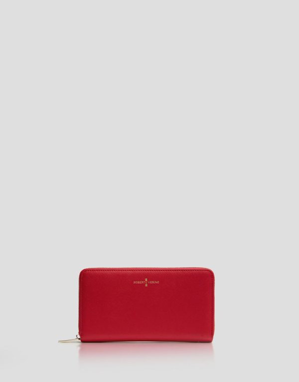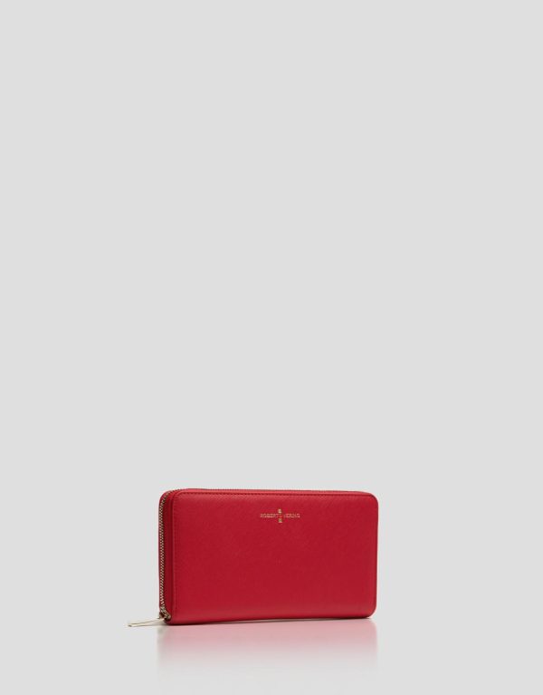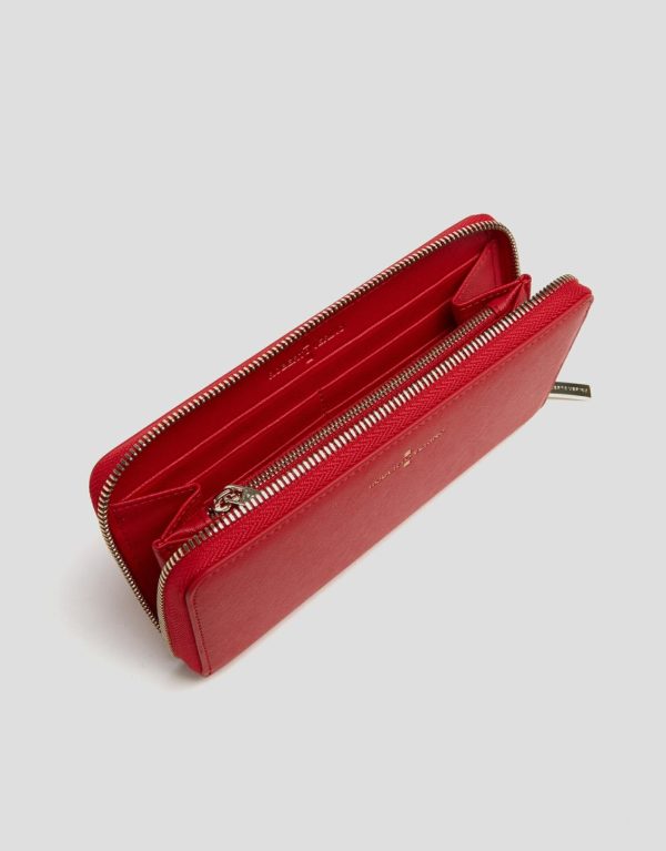 Cartera billetera grande fabricada en piel saffiano color rojo. Cierre con cremallera, frontal personalizado con logo grabado e interior compartimentado para tarjetas y monedas. Acabados metálicos en oro claro. Medidas aproximadas: 19 x 10 x 3 cm