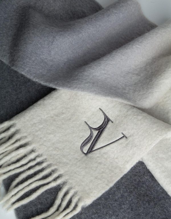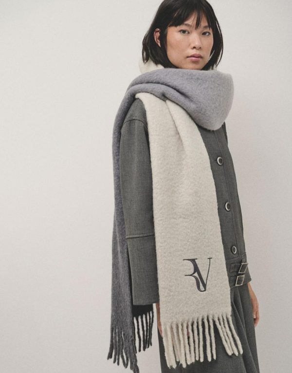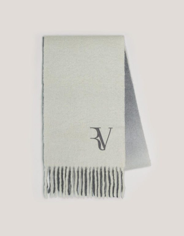 Bufanda en lana, alpaca y mohair en color gris oscuro degradado a gris claro, con logo RV bordado y remate con flecos. Medidas: 245 x 36 cm. Flecos: 15 cm x 2