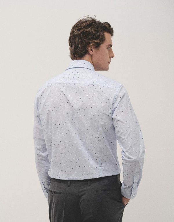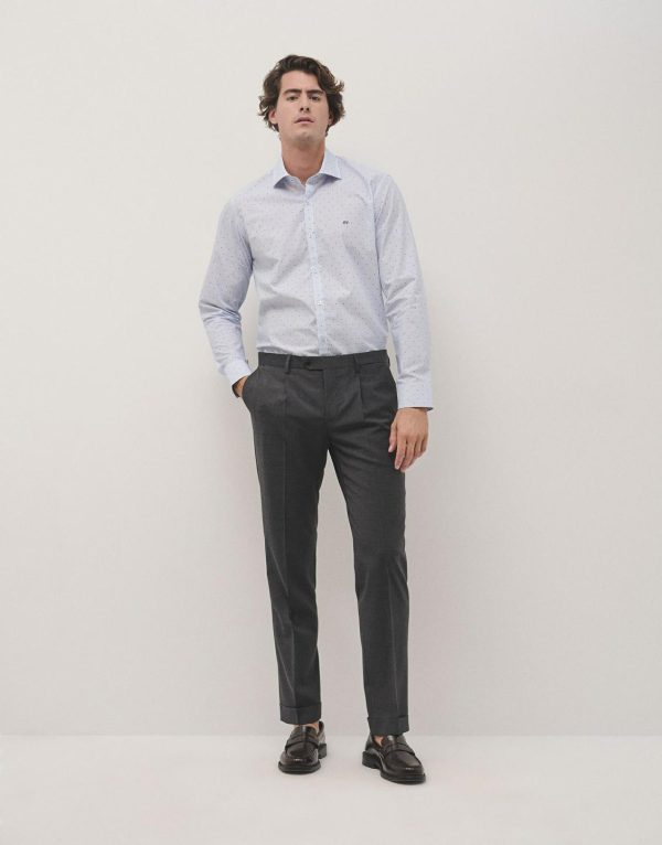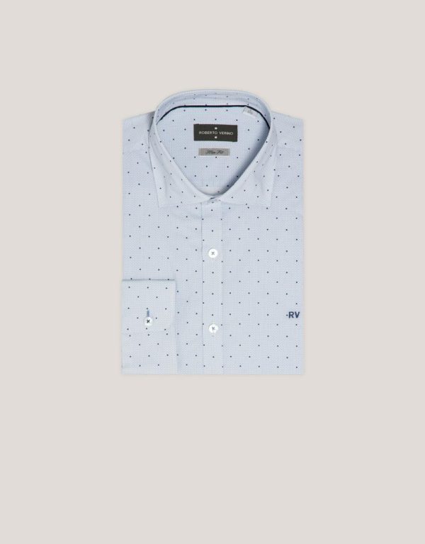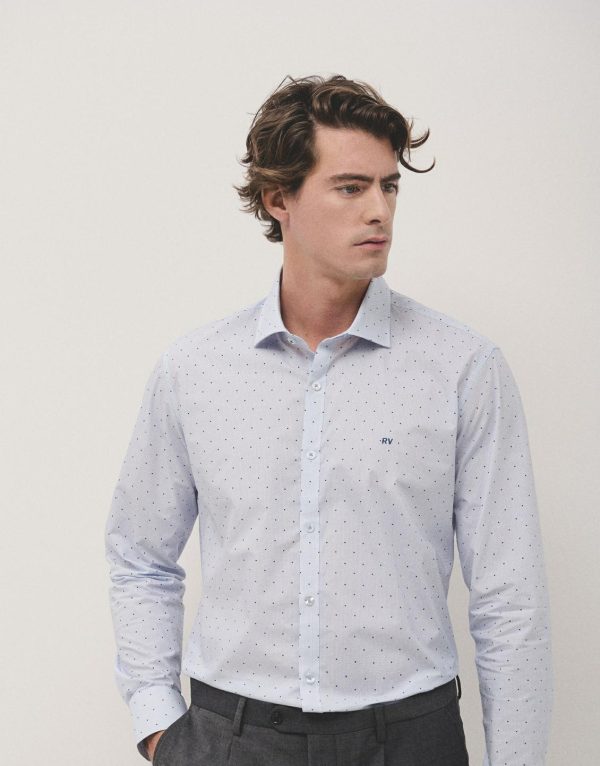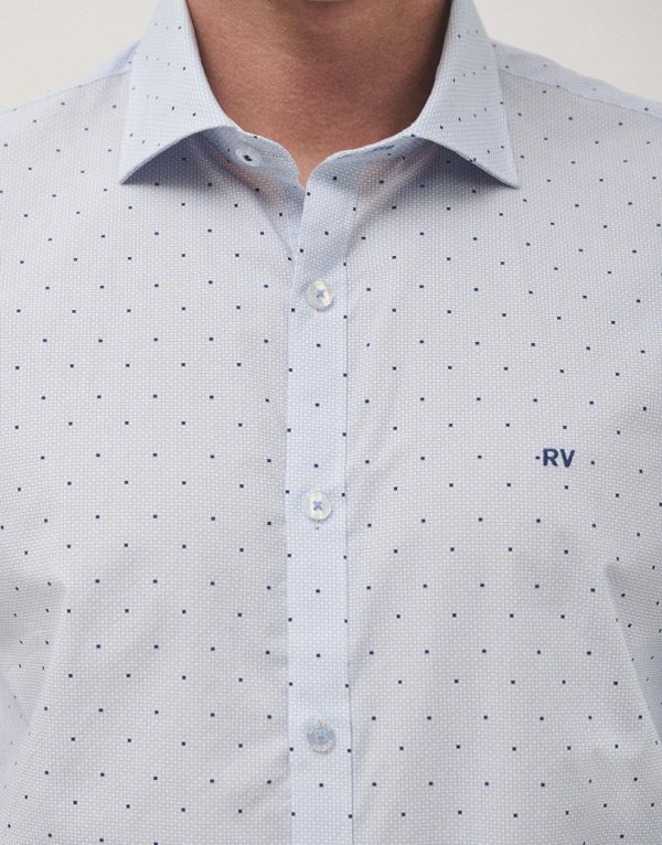 Camisa sport en un algodón estampado geométrico microcuadros en tonos azules. Corte slim, cuello italiano, manga larga y bordado RV en pecho.