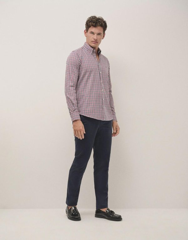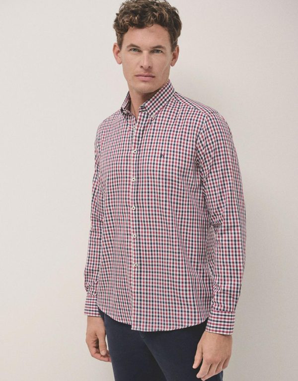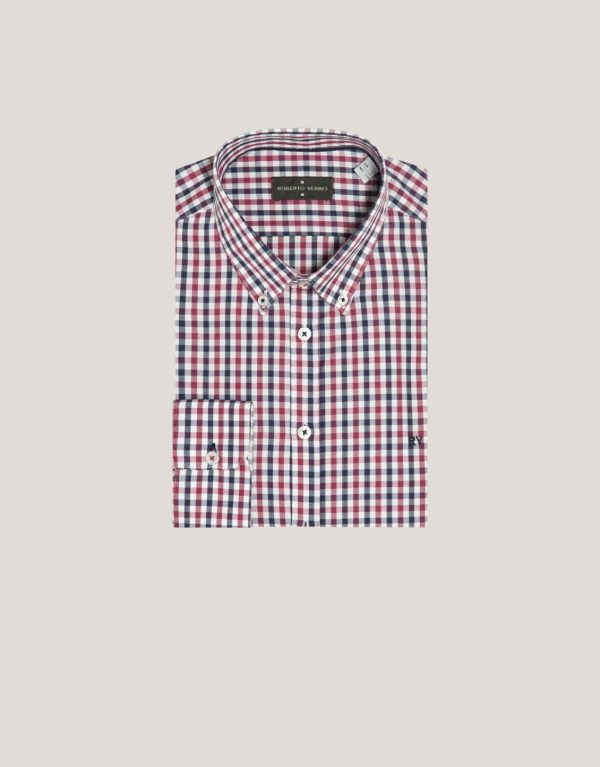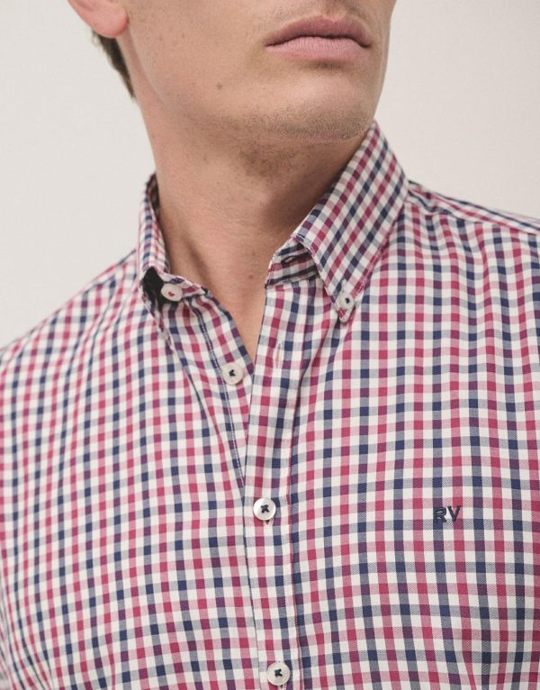 Camisa sport en un algodón de cuadros marino y rojo oscuro. Corte regular fit, cuello pico con botón, cierre mediante botonadura frontal y manga larga terminada en puño abotonado. Bordado RV en pecho.