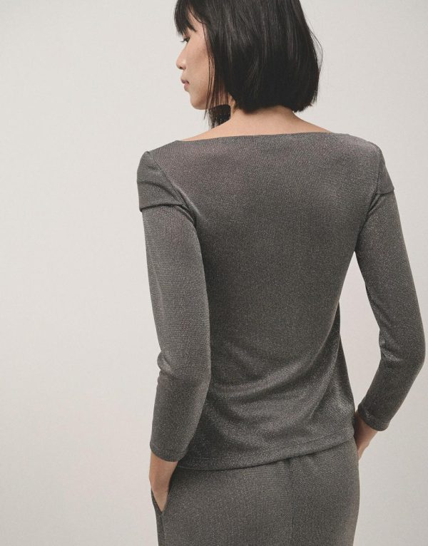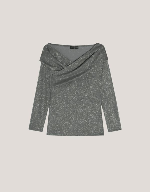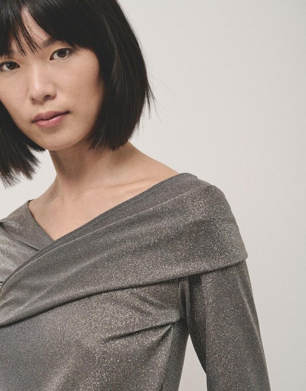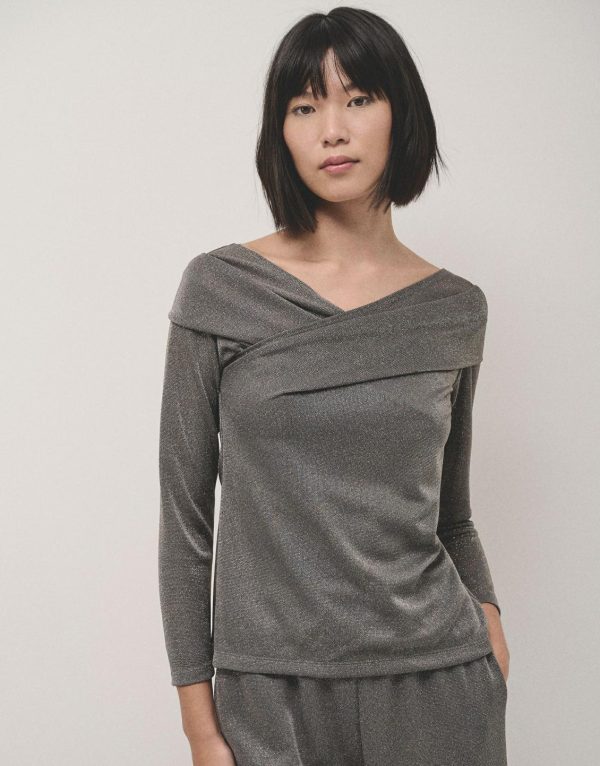 Camiseta manga larga con escote cruzado drapaeado en punto brillante color gris.