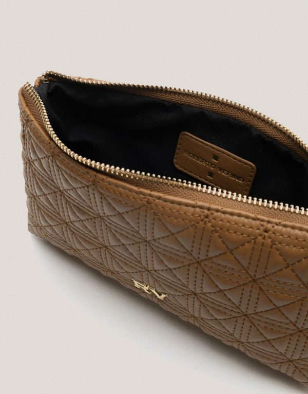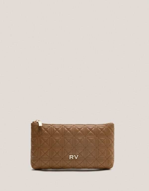 Cartera neceser en piel acolchada color cámel con logo RV metálico en frontal. Cierre mediante cremallera e interior forrado. Medidas aproximadas: 22 x 12,5 x 4 cm
