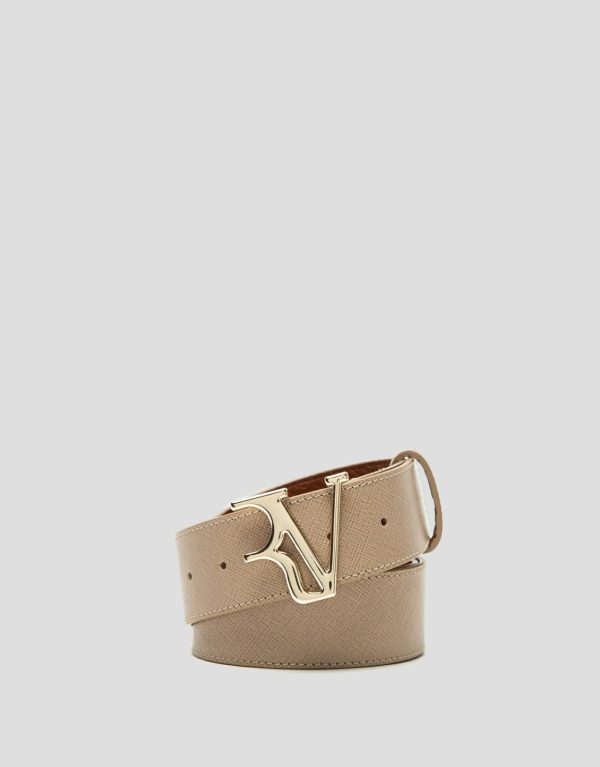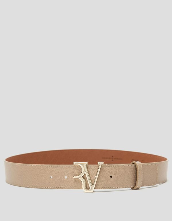 Cinturón en piel color beige con pespuntes a tono, hebilla RV en oro claro y forro personalizado. Ancho: 4 cm