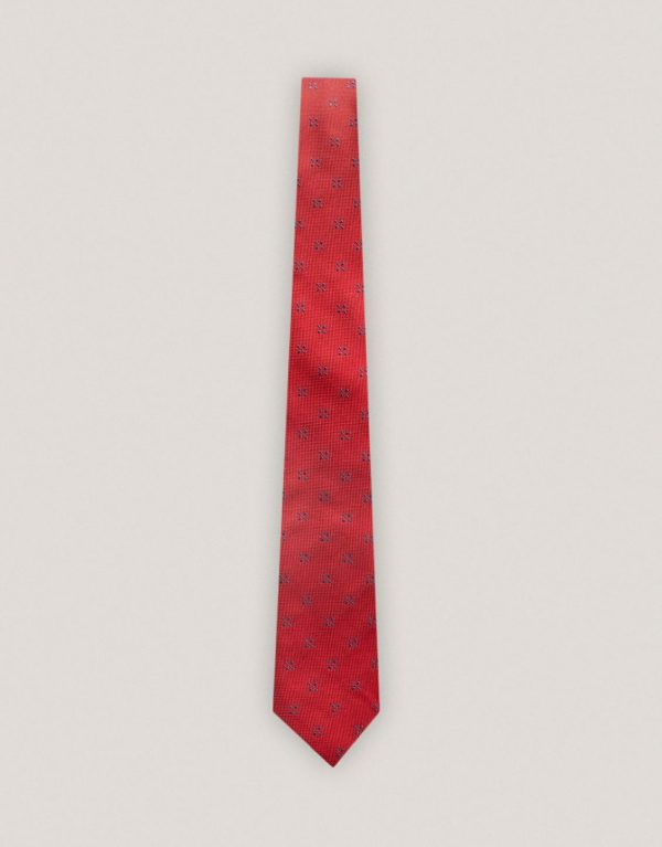 Corbata roja de seda con jacquard de flores color marino. Ancho de pala: 8 cm