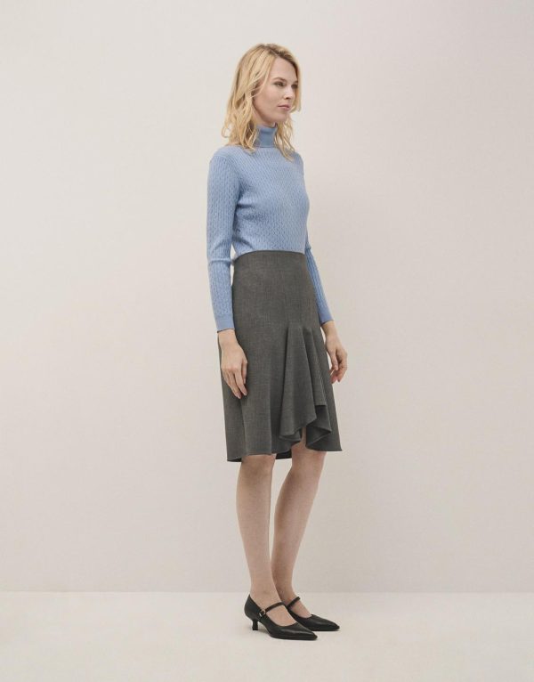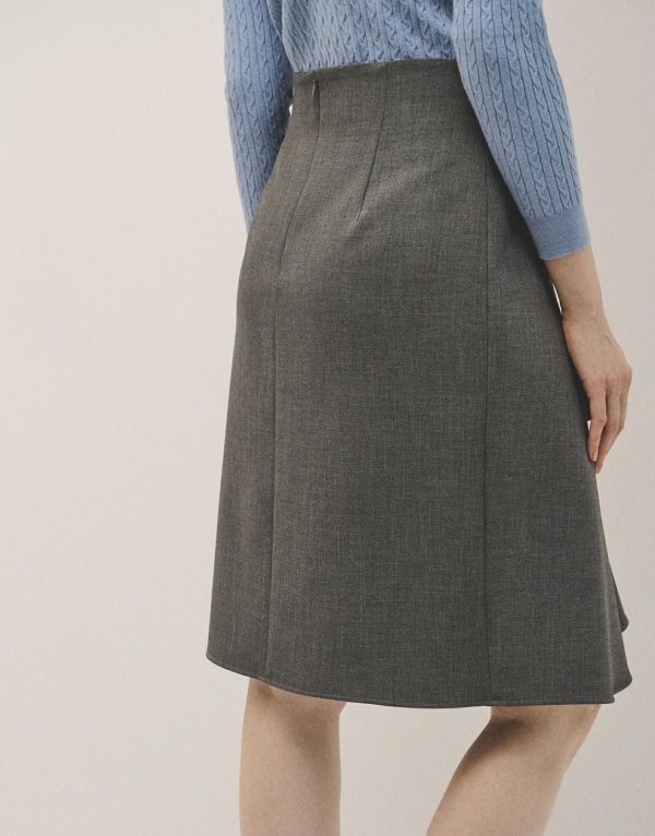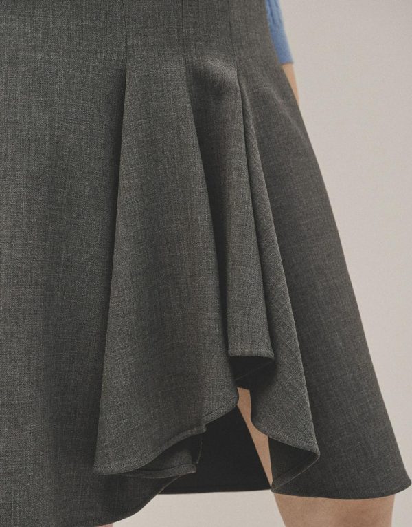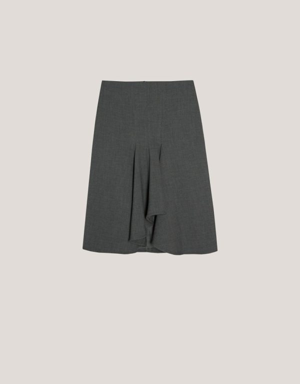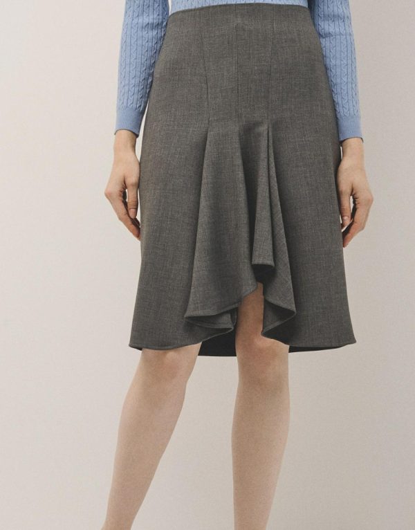 Falda de largo rodilla en un doble crepé gris con cortes escalonados formando un volante en bajo delantero. Cierre con cremallera invisible en centro espalda.