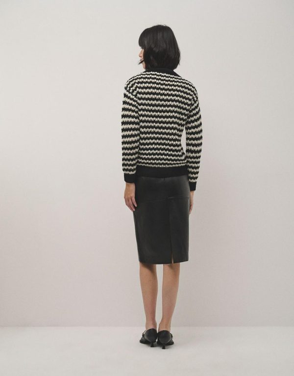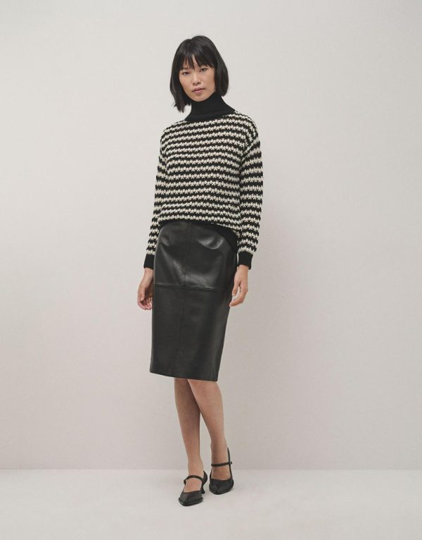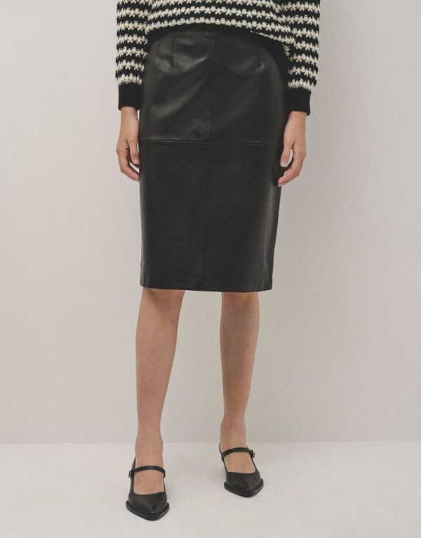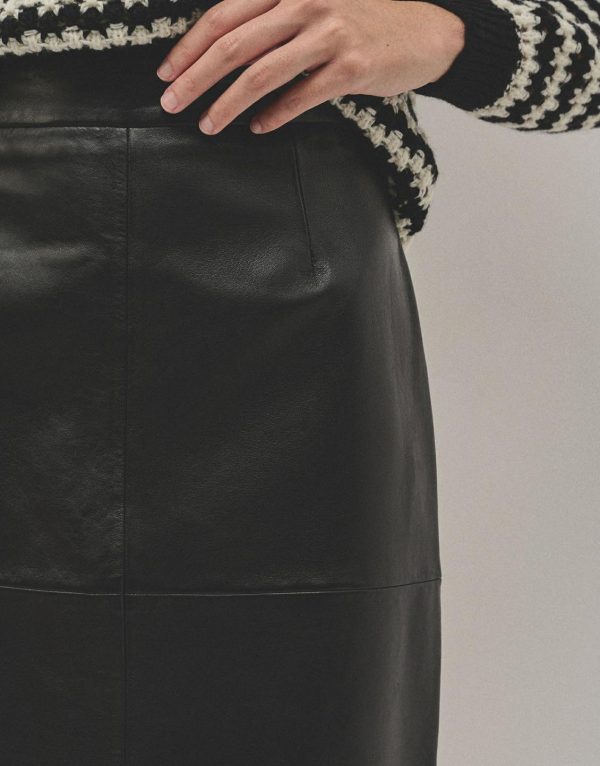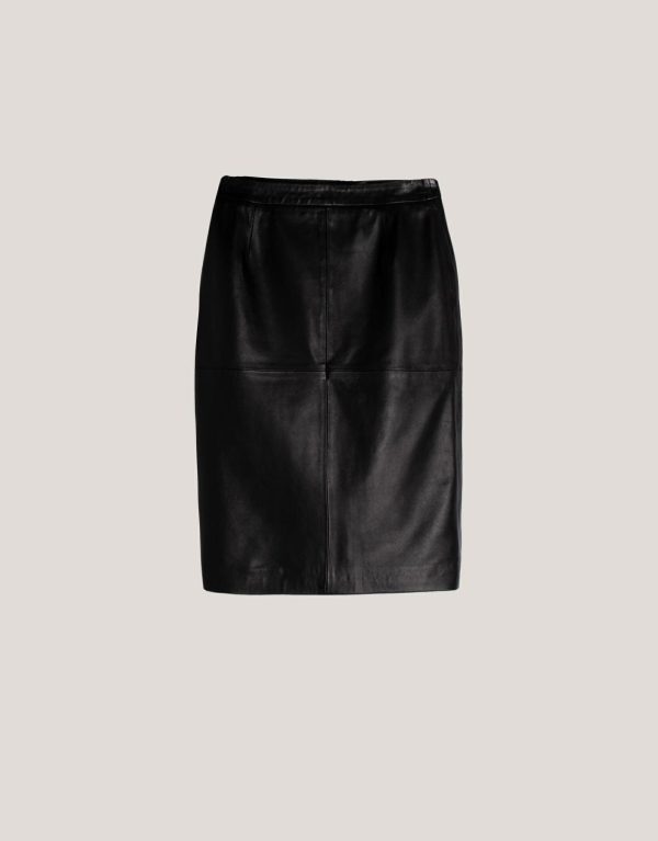 Falda de largo a la rodilla en napa cordero color negro con cortes en delantero, cinturilla y cierre con cremallera en espalda.