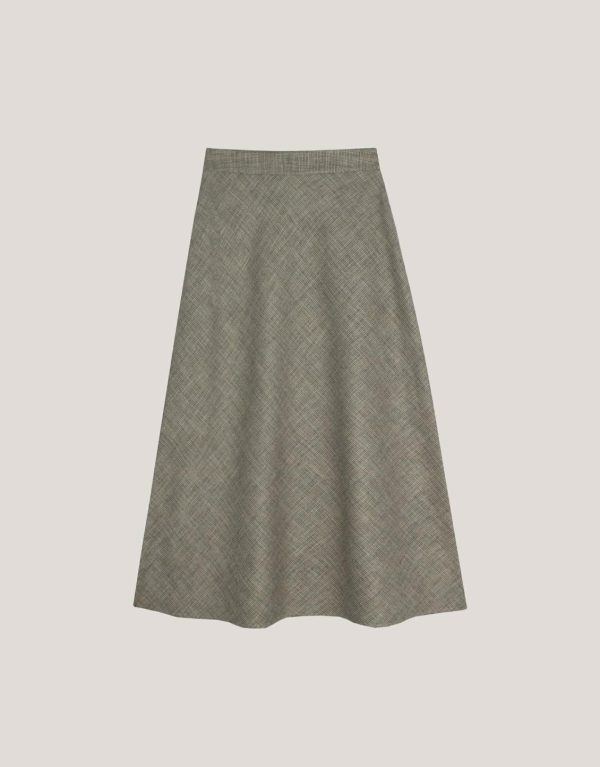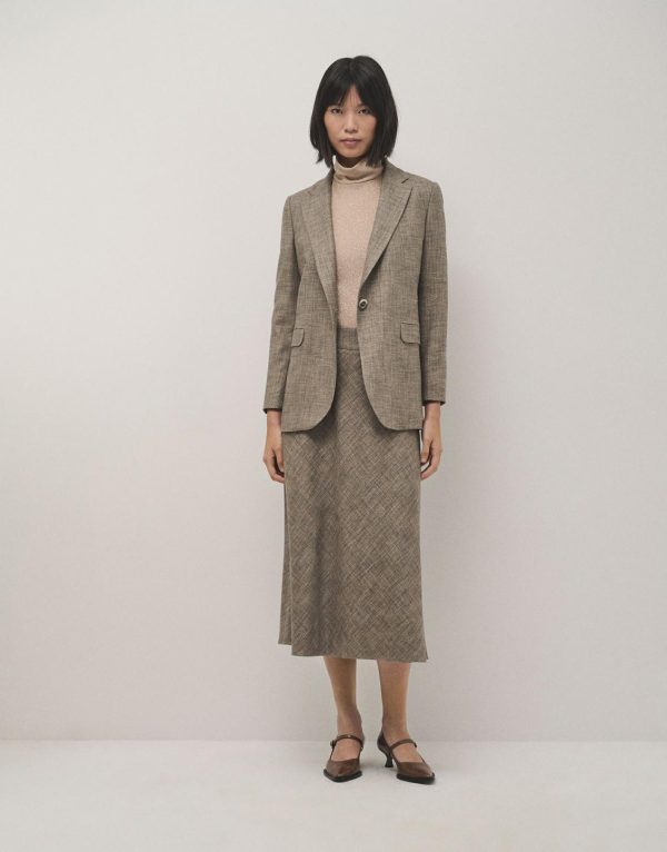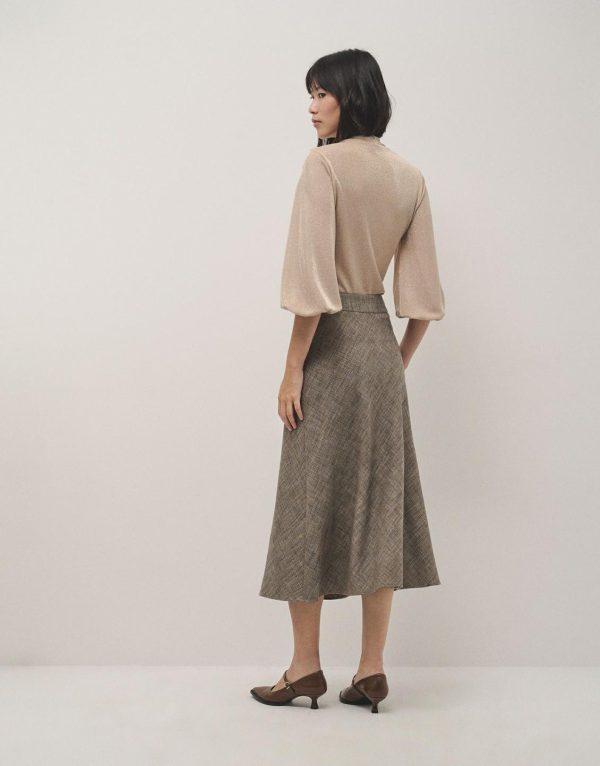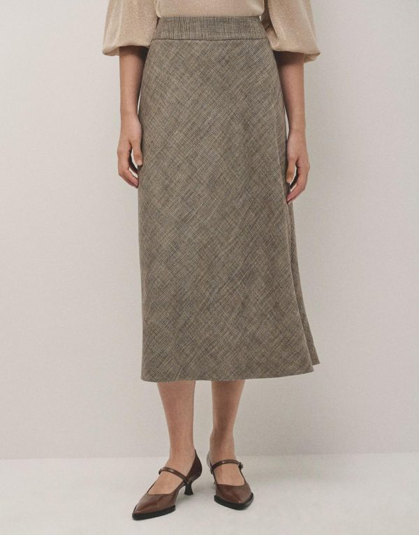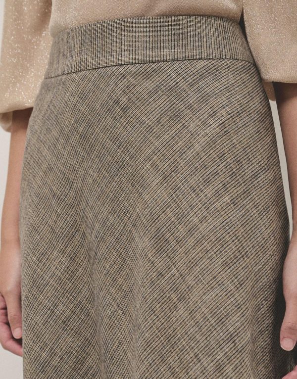 Falda midi en un tejido con microdibujo en tonos beige y azul con un ligero acabado elástico. Cinturilla vista, cierre con cremallera invisible en lateral y bajo con evasé.