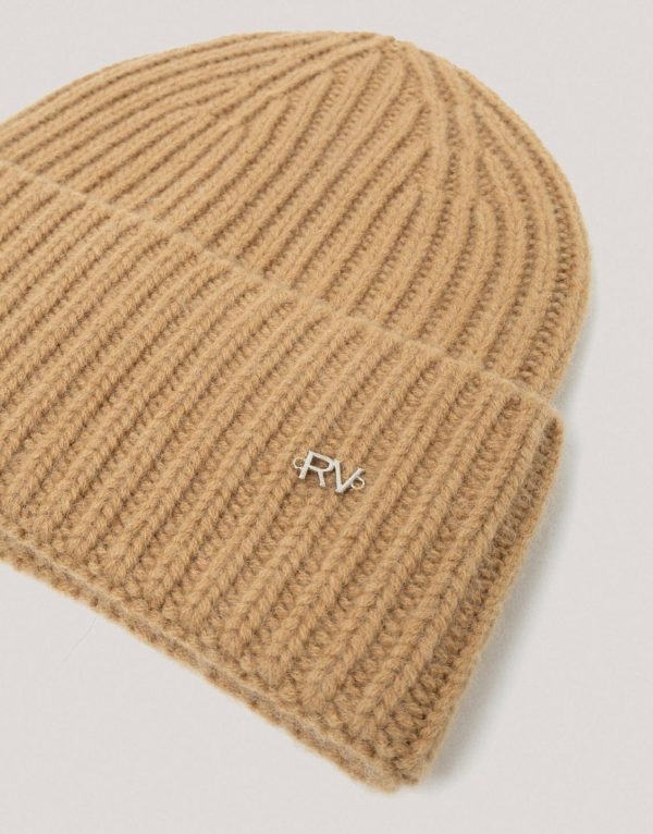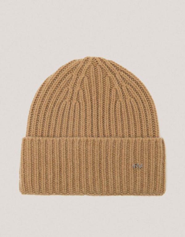 Gorro en punto canalé de lana y cashmere color cámel con vuelta ancha. Cchapa RV en níquel.