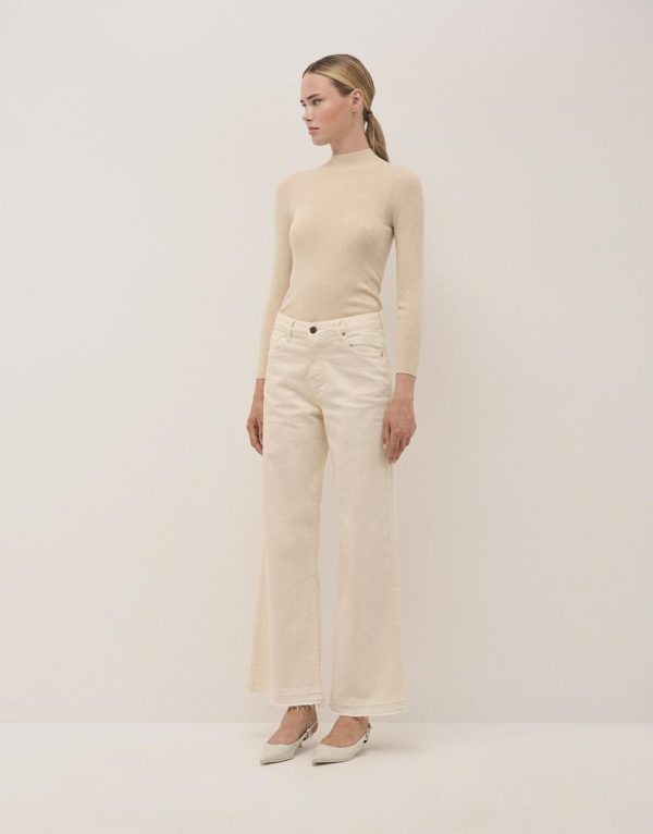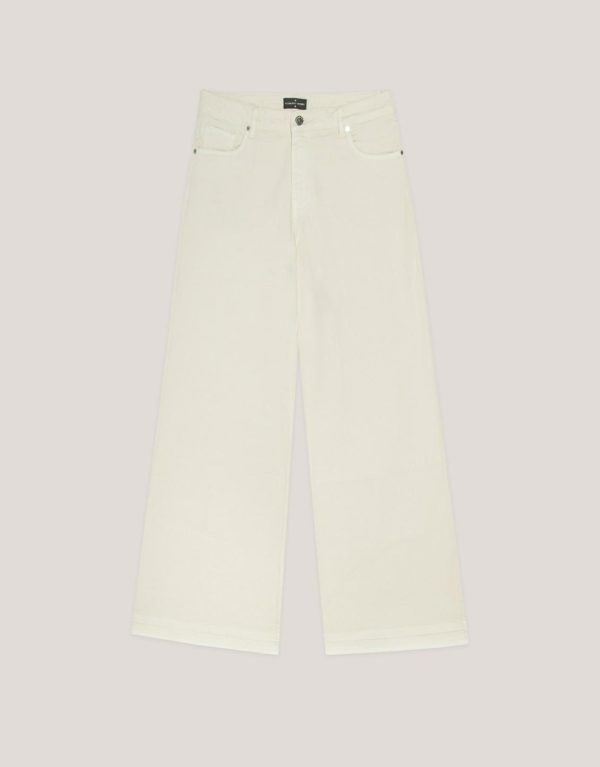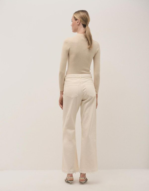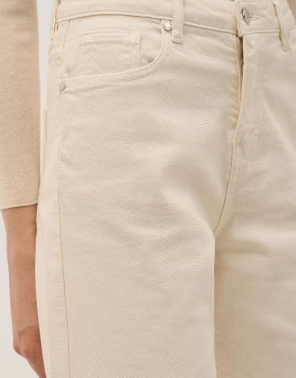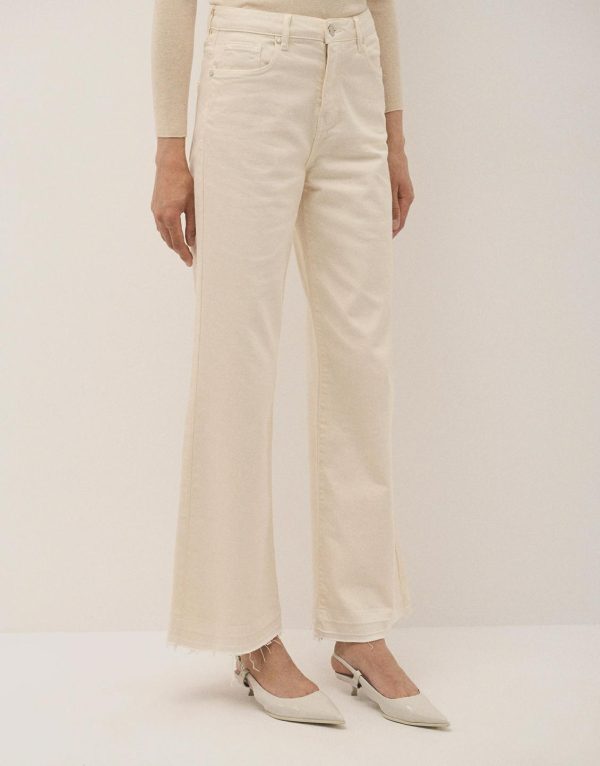 Pantalón ancho en un tejido vaquero color crudo con el bajo desmontado. Cintura con trabillas, canesú en espalda con bolsillos y dos bolsillos redondeados en delantero.