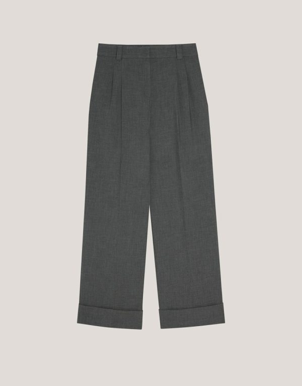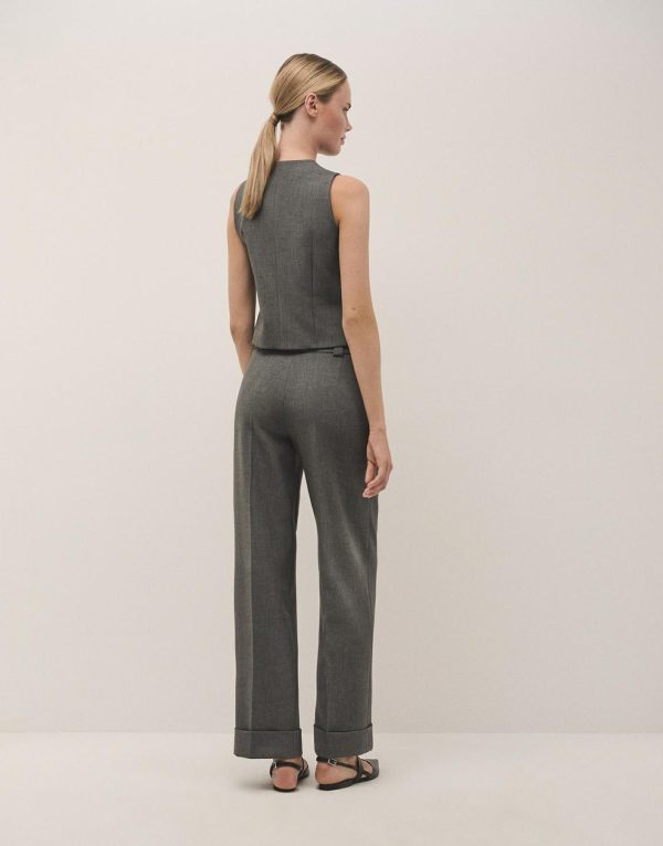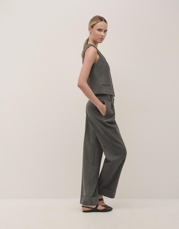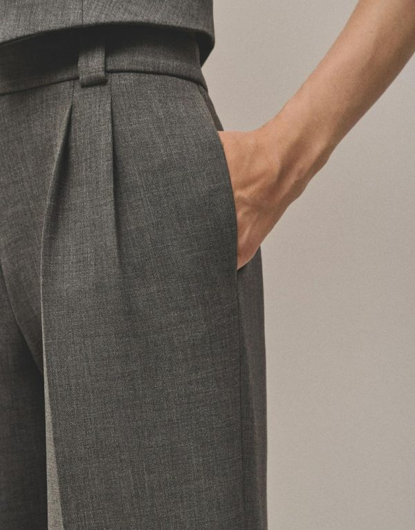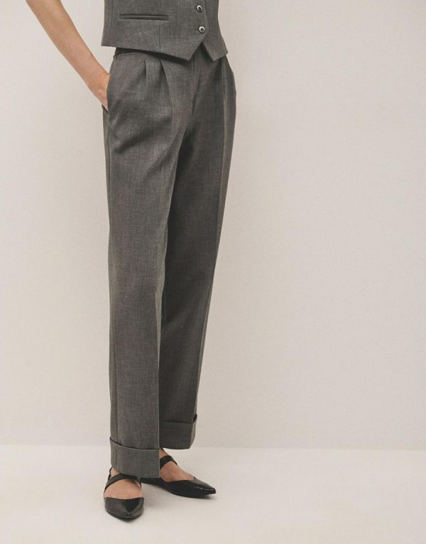 Pantalón sastre recto con pinzas en crepé doble color gris con un ligero acabado elástico. Cintura con trabillas, cierre con cremallera oculta, dos bolsillos laterales en delantero y bajo con vuelta.