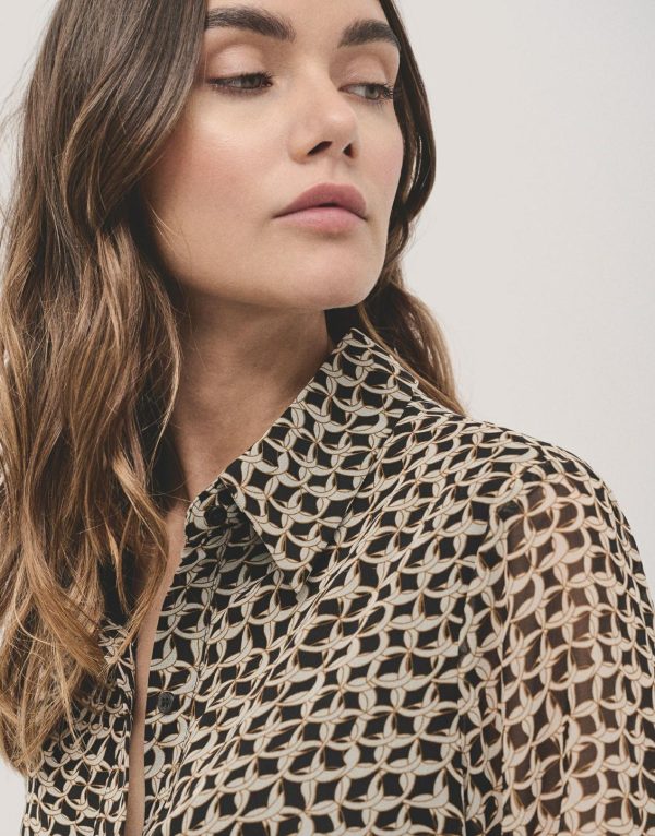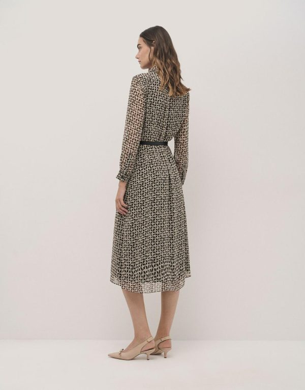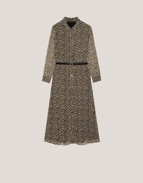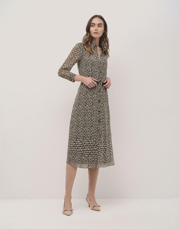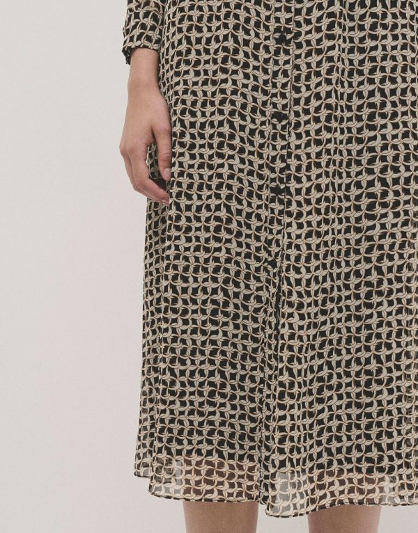 Vestido camisero midi de manga larga en una gasa semitransparente con estampado geométrico en tonos marrones y beige y con forro negro en el cuerpo. Cuello camisero, mangas abullonadas con puño y cierre con botonadura en delantero y con cinturón.